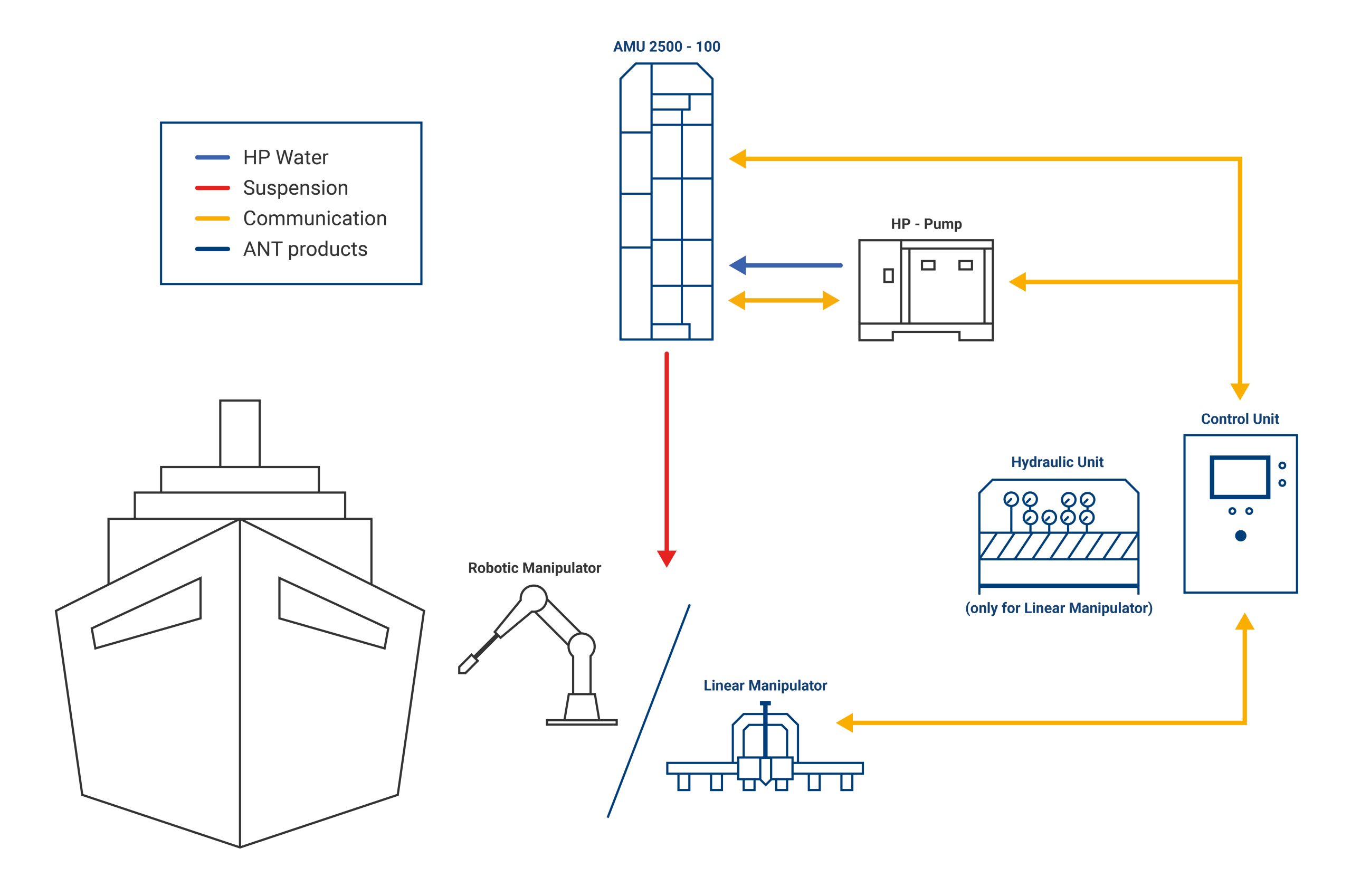 Since the abrasive particles in WAS systems are directly bound in the water, the ANT suspension jet is significantly more stable, precise, and up to three times more powerful than the injection jet. There is no air in the jet and no unwanted air bubbles are produced underwater. Due to the special ANT nozzle geometry, WAS systems do not require high pressure and consequently save resources. Regarding the material, there is no limitation, anything can be cut. We have already cut steel of one meter thickness.