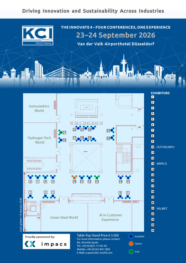 Join us in Düsseldorf, Germany, for the 2026 editions of Green Steel World, Hydrogen Tech World, Instrumetrics World – The Energy Conference, and Evolution CX – The AI Conference. View the floor plan and reserve one of the highly sought-after tabletop booths to showcase your products, meet customers face-to-face, and connect with key industry players.