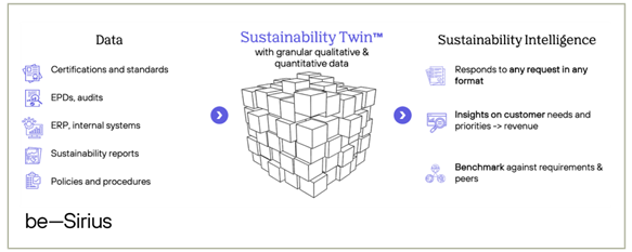 On the beSirius platform, the company created a Sustainability Twin™, a digital backbone that mirrors the company’s sustainability profile. The Twin was built around the company’s organizational structure, product portfolio, and operational processes. It incorporates all relevant sustainability data, including emissions, energy use, human rights, circularity, compliance, and updates regularly as new data becomes available.