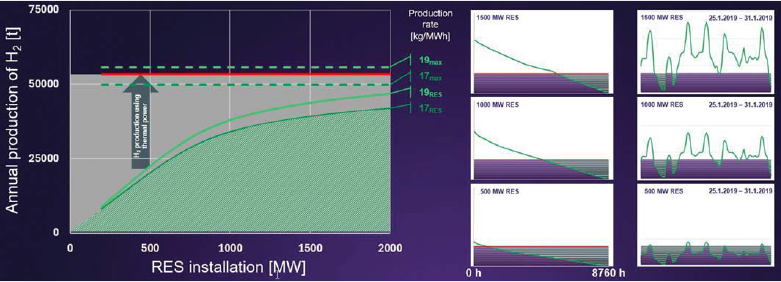 The RES power generation profile was evaluated hourly, with an average hydrogen production calculated at 18±1 kg H2/MWh, assuming 360 MW of electrolyzer capacity. The sensitivity study results for Spain are shown in Figure 2. The hydrogen demand of 53,404 t H2 is indicated by the red line (2,3,4). Bold lines represent green hydrogen production and hydrogen from other power sources. The diagrams on the right show annual RES generation curves for 500 MW, 1,000 MW, and 1,500 MW, with green lines for RES, purple for electrolysis based on green power, and grey for hydrogen from other sources. Hydrogen production is based on hourly RES generation for the three cases during the week of 25–31 January 2019.