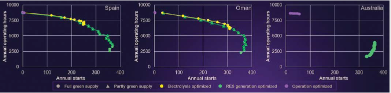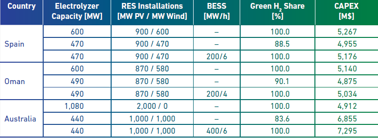 The RES profiles for Spain and Oman assume grid connection, allowing the use of non-RES power. In a second stage, a BESS is added to further reduce the carbon footprint of hydrogen production – up to producing it completely green.