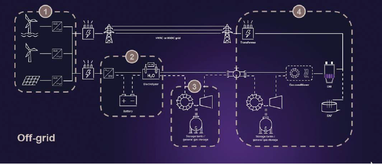 For off-grid projects, all power must come from RES, considering the demand of arc furnaces and other steel plant equipment (4) or other off -grid operations. The sizing of BESS or other systems (2) must account for this demand, prioritizing operations during power shortages. Hydrogen storage (3) during excess RES periods may be necessary to ensure this prioritized operation.