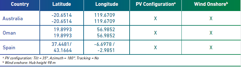As stated above, the main challenge for a reliable green hydrogen supply arises when intermittent RES like wind and PV are used. To evaluate green hydrogen production, different boundary conditions based on hourly generation profiles in various countries are considered. These profiles – sourced from renewables.ninja (5) and based on 2019 weather data – are analyzed throughout the whole year (see details in Table 1). For onshore wind, the hub height has been adjusted according to assumptions by the National Renewable Energy Laboratory (NREL) of the U.S. Department of Energy, to align with their published installation costs.
