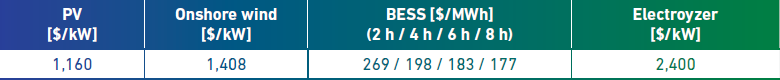 The energy system was optimized for the lowest investment costs, with accuracies of ±50 MW for RES generation, ±10 MW for electrolyzer installation, and BESS ratings of 200 MW, 400 MW, 600 MW, and 800 MW – with capacities of 2 h, 4 h, 6 h, or 8 h. Costs were normalized to publicly available data from NREL for wind, solar, and BESS (6), and extrapolated to 2030 according to the moderate scenario. Hydrogen electrolyzer costs were based on data from the European Hydrogen Observatory,7 valid for utility-scale installations, with adjustments for local price corrections and taxes.